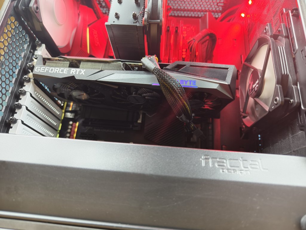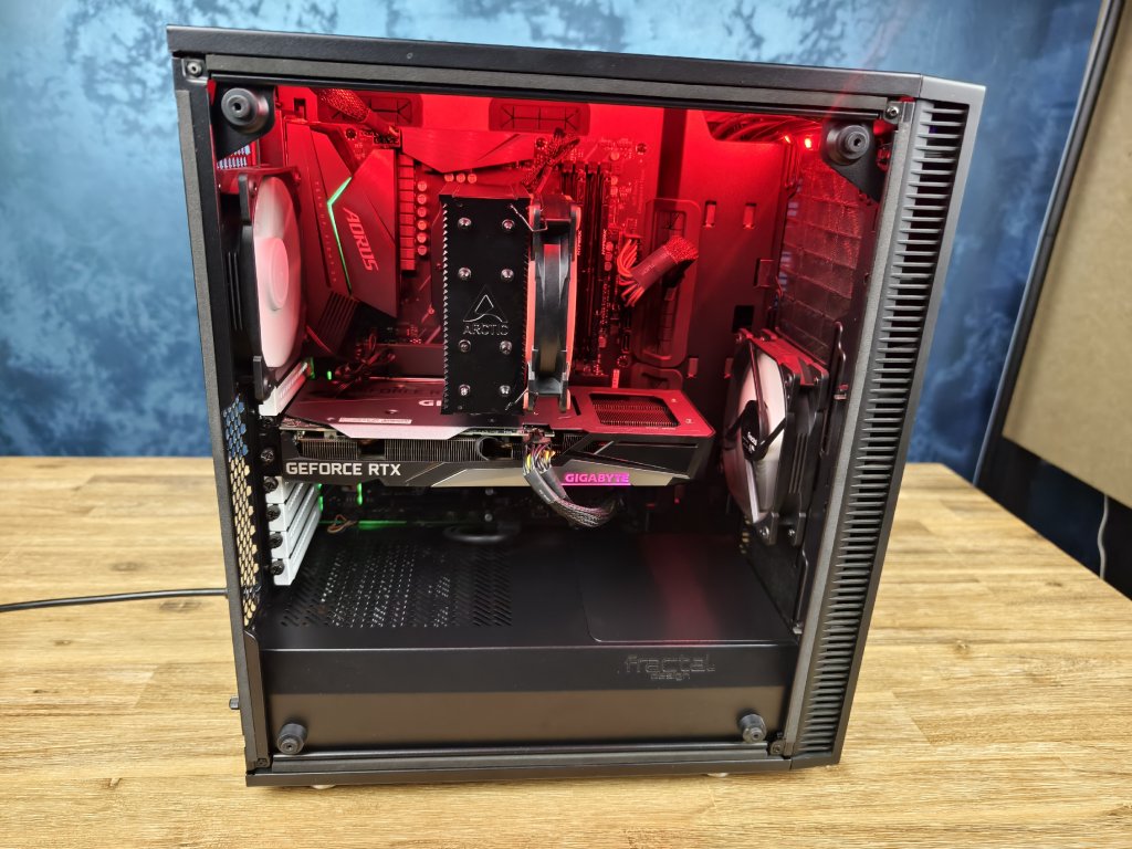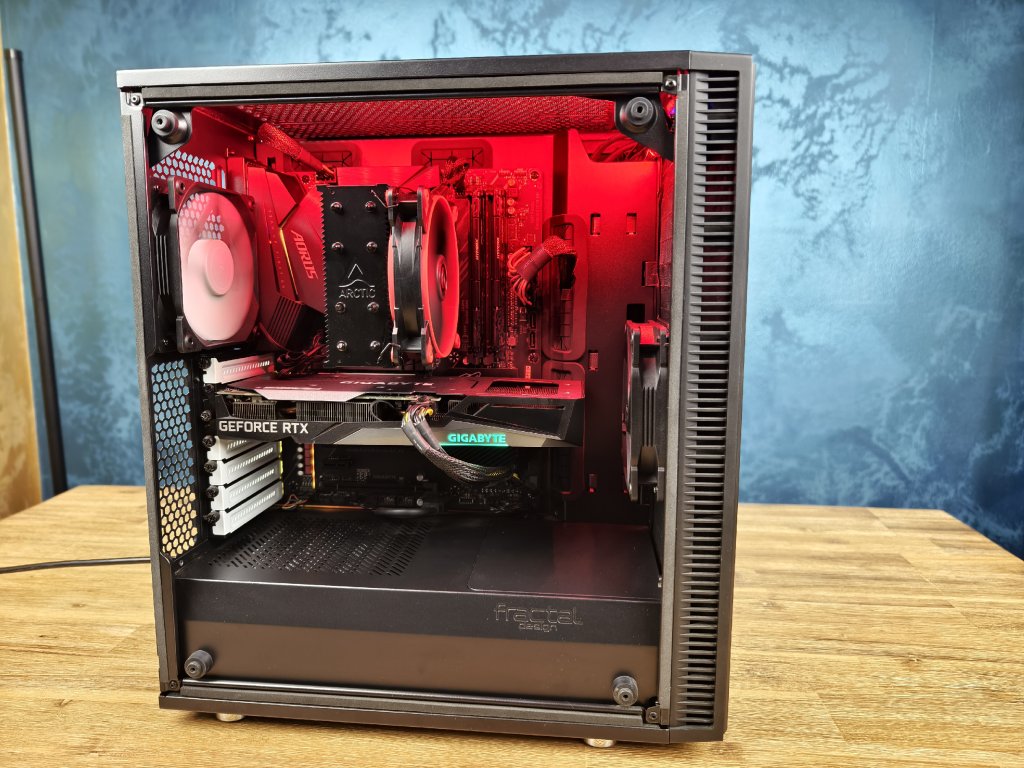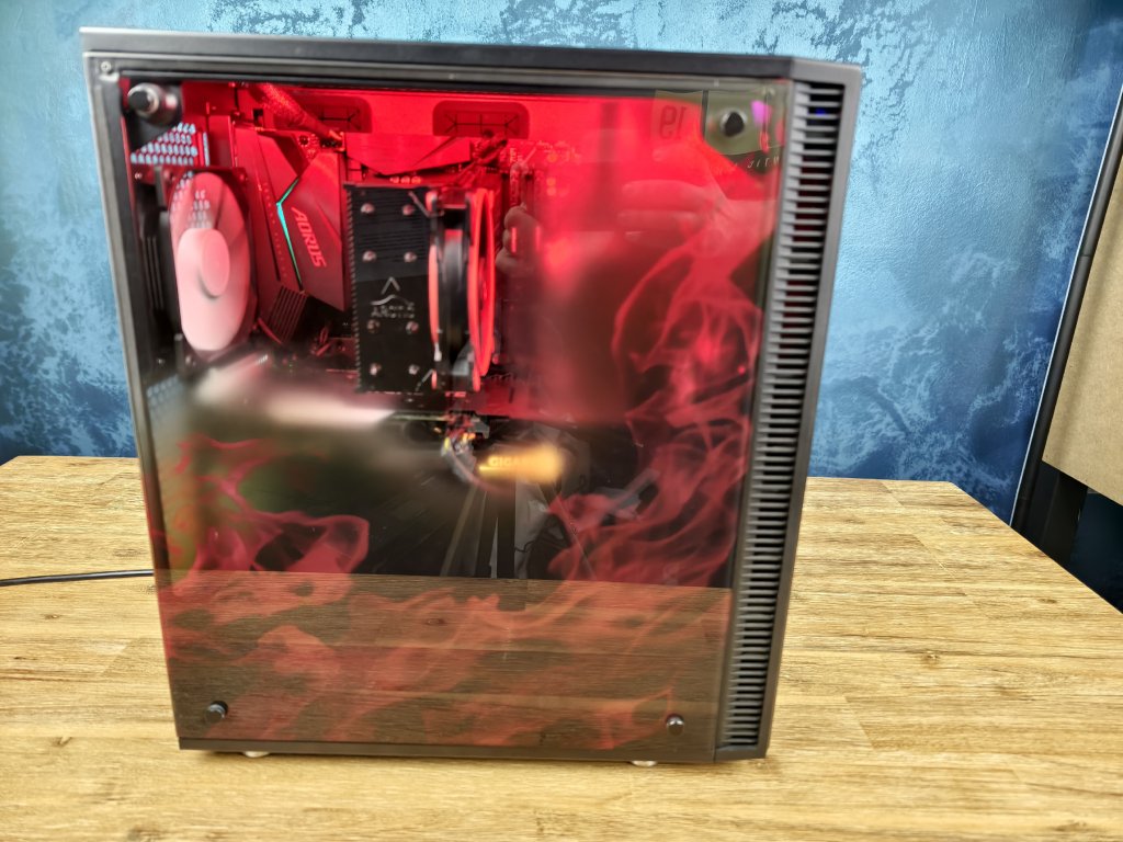 * skříň Fractal Design s airbrusch plameny na bočnici a červeným led páskem